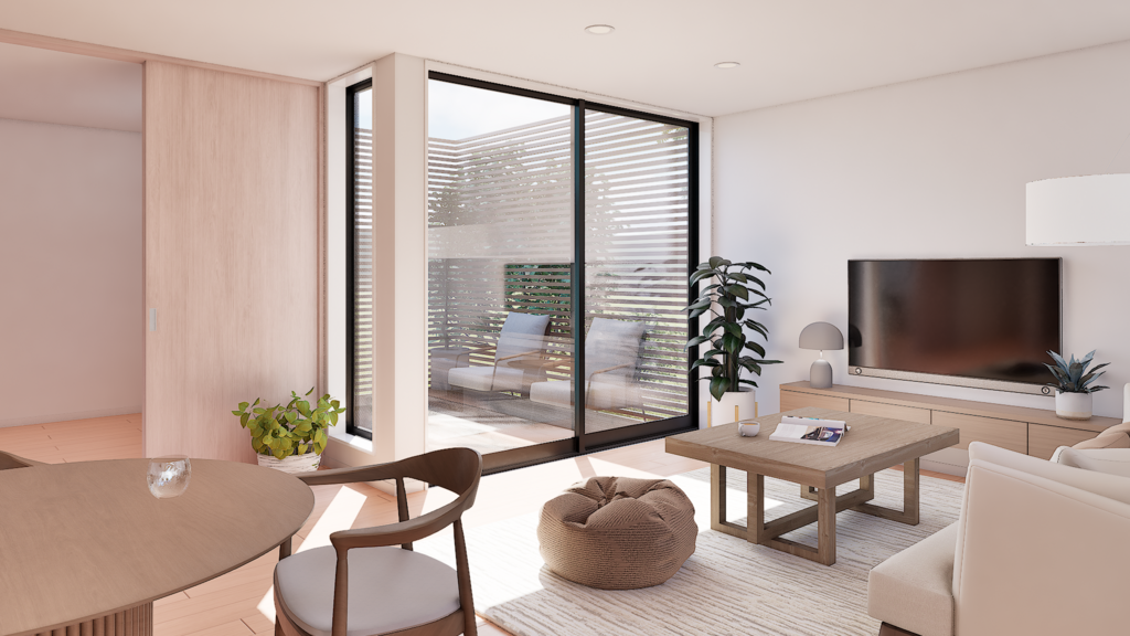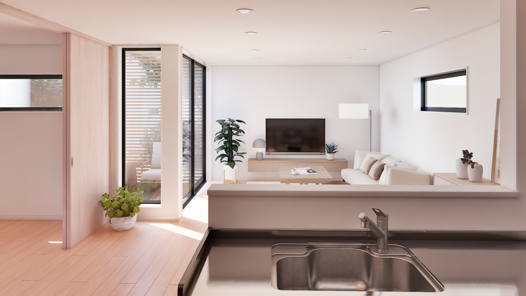 中庭に面した大開口のLDK は、外からの視線を気にせず自然光がたっぷり入るストレスフリーな空間。キッチンに立てばリビング・ダイニング・中庭まで見渡せるから、料理をしながら子どもの様子もしっかり見守れます。