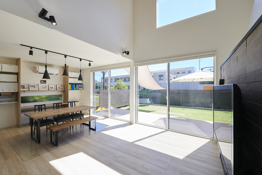 大きな窓と吹き抜けで解放感溢れる明るいLDK。