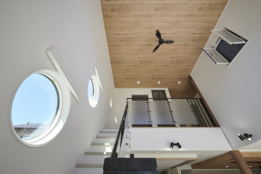 日差しの角度が計算された大きな窓から差し込む日差しで、冬は家全体を温める省エネ住宅の要。