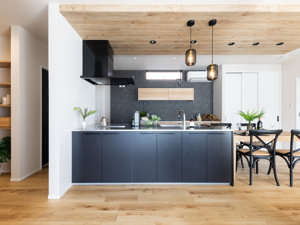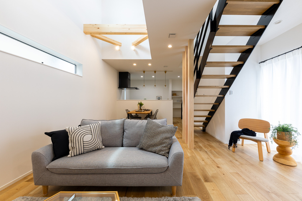 勾配天井が生み出す開放感あふれるLDKは、家族が自然と集まる心地よい空間に。