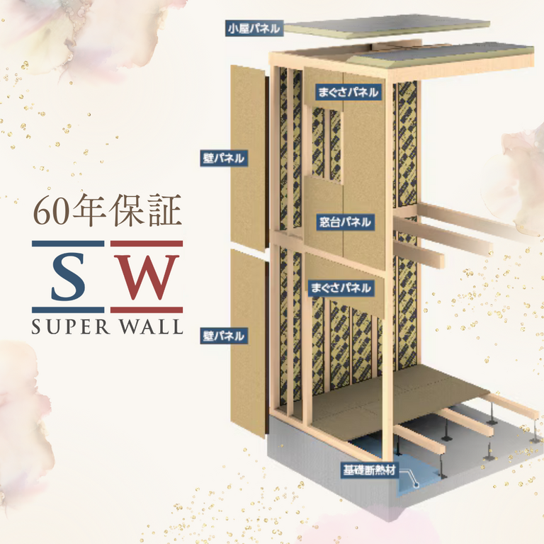 SW(スーパーウォール)工法は、高性能パネルや高断熱サッシ、計画換気によって「高気密・高断熱・高耐震」を実現する住宅です。さらに SW(スーパーウォール)ウレタン無結露60年保証にも対応しています。