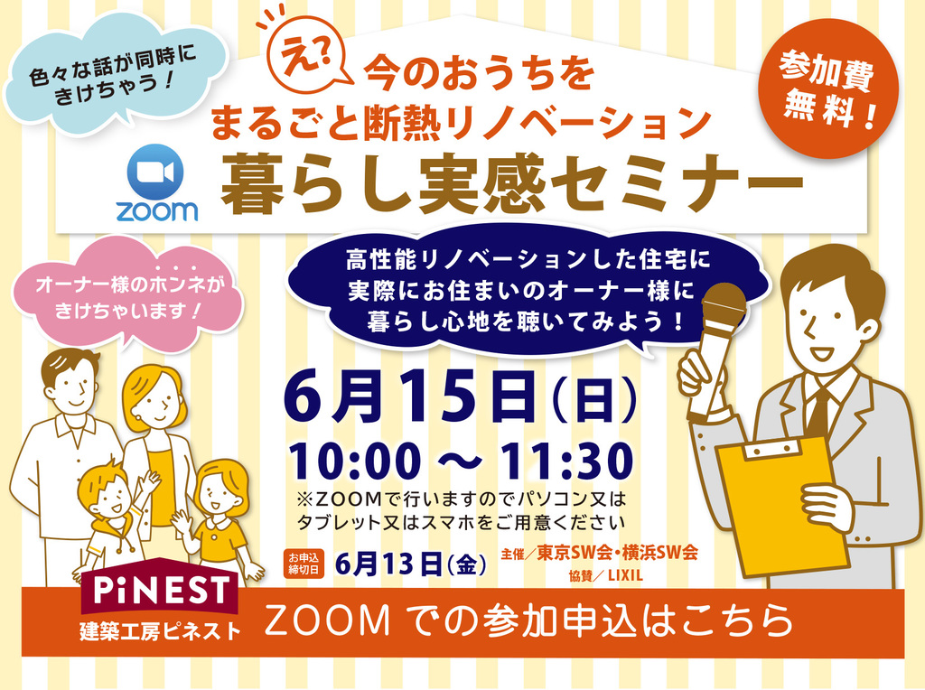| タイトル | 【目黒区】6/15(日)高性能リノベーション『暮らし実感セミナー』開催!【zoom視聴予約】 |