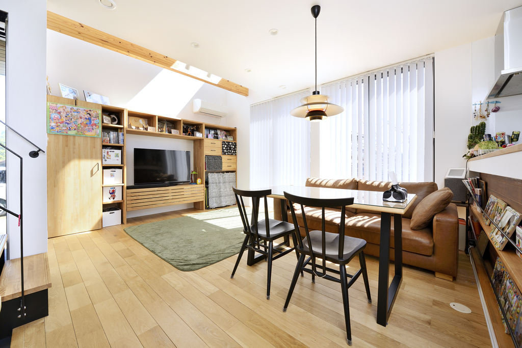 吹抜けから降り注ぐ日差しで1日中快適に暮らせ、オープンで抜け感のある1Fは面積以上の広がりを感じることができます。