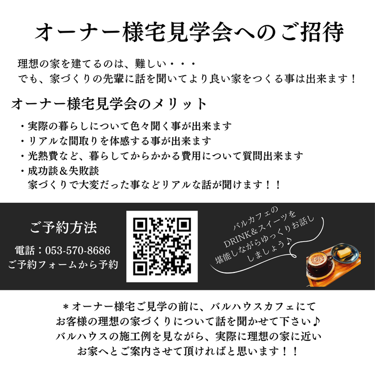 また、より理想の家に近いオーナー様宅へご招待したい為、一度、バルハウスカフェにて、お客様の家づくりのイメージ&優先順位などゆっくりとカフェドリンク&スイーツを堪能しながらお話させて頂ければと思います。