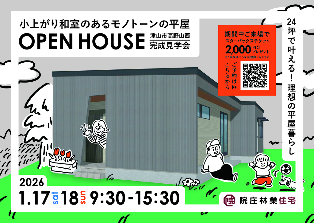 | タイトル | 🏠【津山市高野山西】24坪で叶える!理想の平屋暮らし。小上がり和室のあるモノトーンの家・完成見学会 |