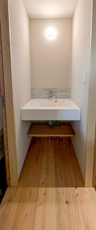 内壁にはオガファーザーを使用していますが、一部分にアクセントとして「木」を貼っています。