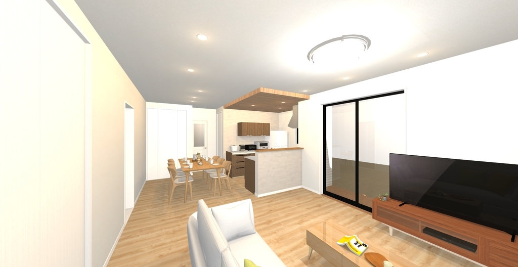 キッチンと横並びダイニングからの視線の先に開放感あふれるリビング
