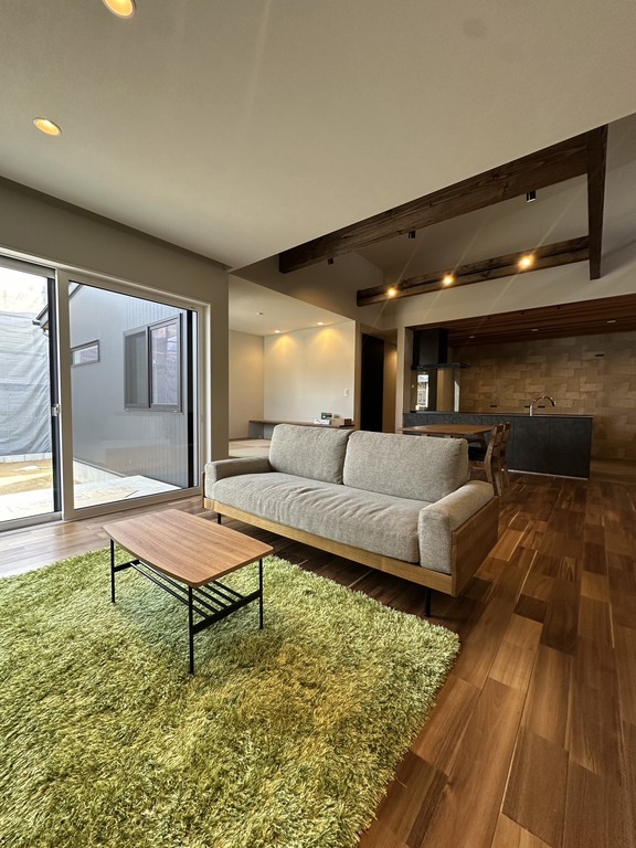 無垢の床材の温もりに、存在感のある化粧梁、そしてくつろぎの小上がり和室を組み合わせたインダストリアルモダンな空間。デザイン性と居心地の良さを兼ね備え、家族が自然と集まる心地よいリビングを実現しました。