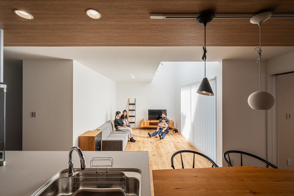 1階に和室を設けて普段は子どもが遊んだりのんびりくつろいだりしながら、親御さんが泊りに来た時には建具で空間を仕切れるようにしてある32坪(3LDK+和室+WIC)の2階建てとなっています。