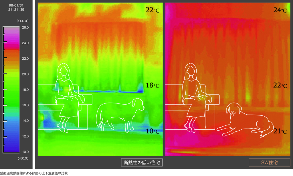 日本の家のおよそ90% が現行省エネ基準に満たない、断熱性能の足りない住宅です。スーパーウォール工法は、寒い季節、家のどこにいても、足元まで暖かい。さらに、耐久性・耐震性(耐震等級3)にも優れています。
