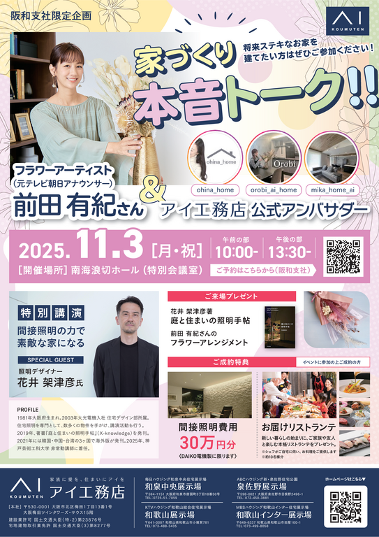 | タイトル | 11月3日アイ工務店 公式アンバサダーによる本音トークイベント 会場:南海浪切ホール |