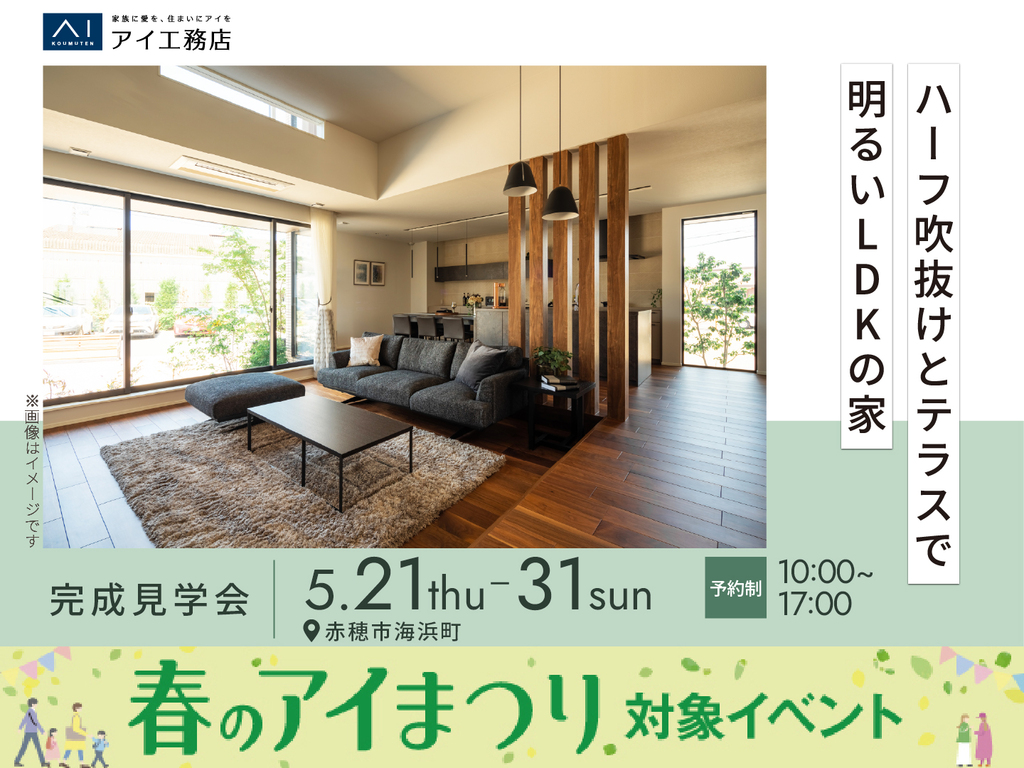 | タイトル | 姫路西展示場 《赤穂市海浜町》ハーフ吹抜けとテラスで明るいLDKの家 完成見学会 |