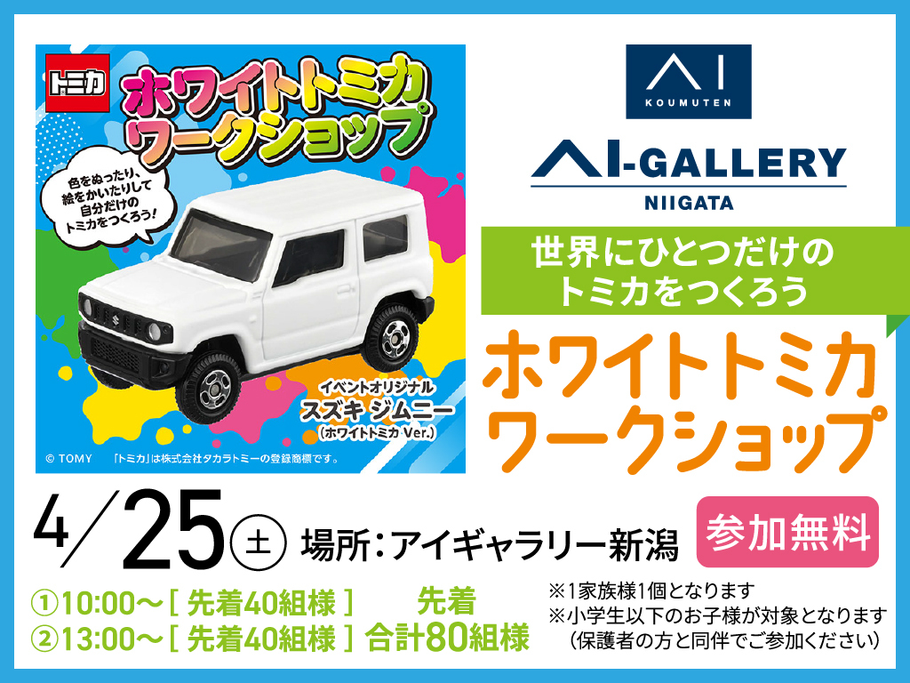 | タイトル | アイギャラリー新潟(ショールーム併設型住宅展示場) ホワイトトミカワークショップ【先着合計80組様】 |