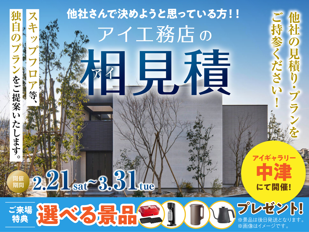 | タイトル | アイギャラリー中津(ショールーム併設型住宅展示場) アイ工務店の相見積キャンペーン |
