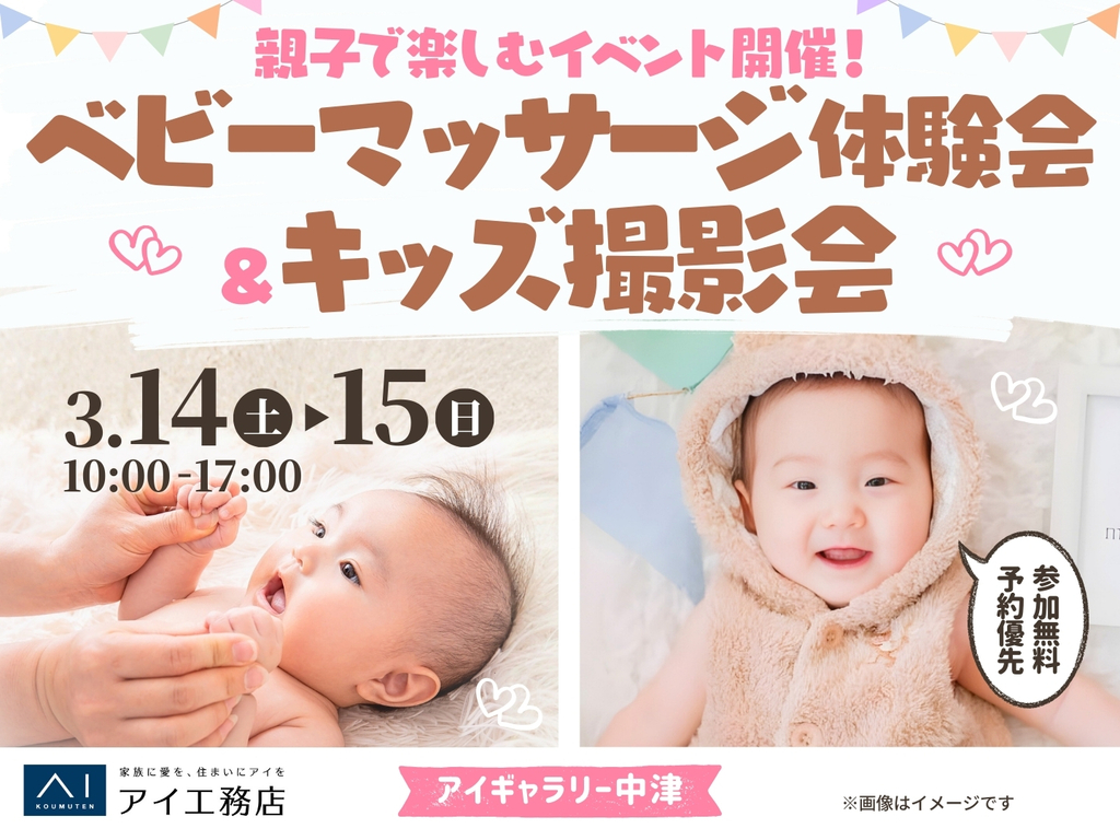 | タイトル | アイギャラリー中津(ショールーム併設型住宅展示場) ベビーマッサージ体験会&キッズ撮影会 |