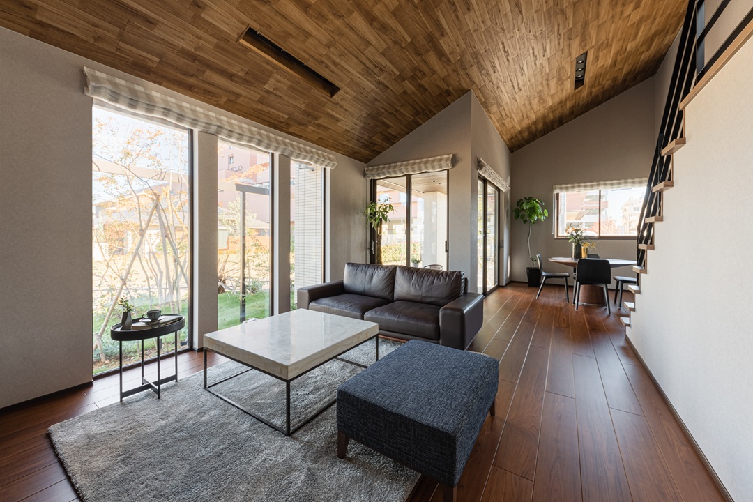 勾配天井でリビングの縦空間が広がり、圧倒的な開放感を体感できます。