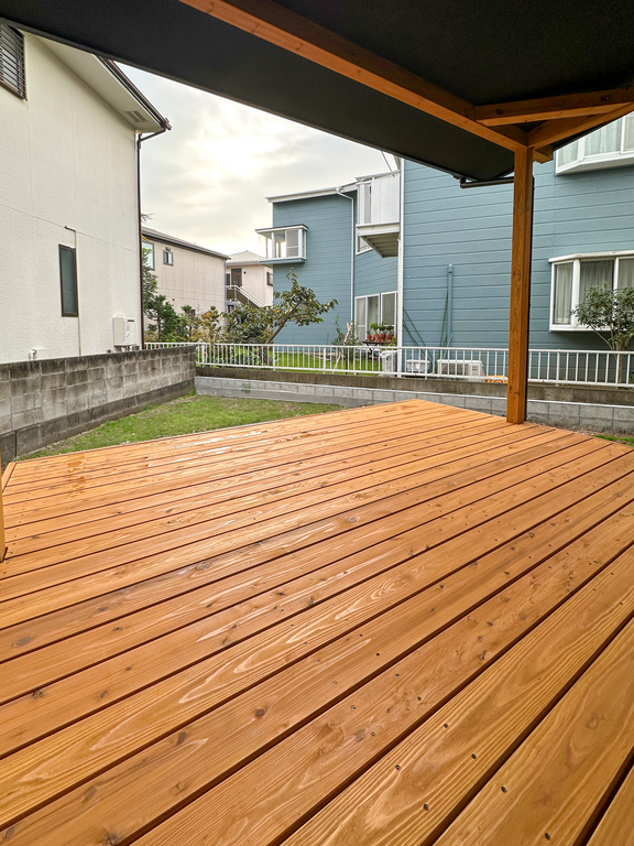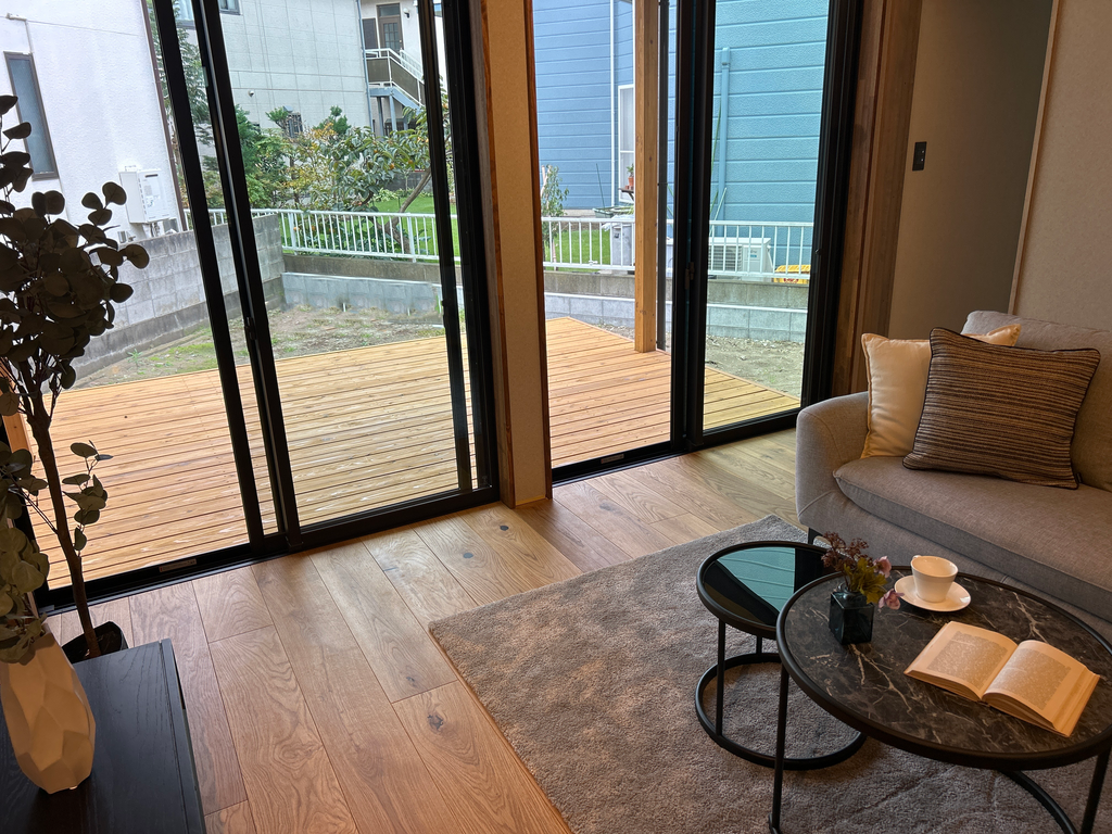 リビングからつながるウッドデッキは、その奥に広がる庭との一体感を生み出します。