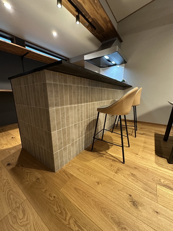 上質な雰囲気をつくる、ダークトーン×タイルキッチンのLDK