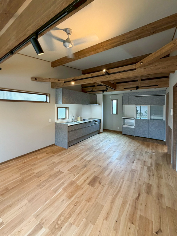キッチンとカップボードは壁付けのL型配置とし、空間をすっきりと広く使える工夫を。さらに玄関ポーチを拡張することで、外観のアクセントと使い勝手の良さを両立しています。
