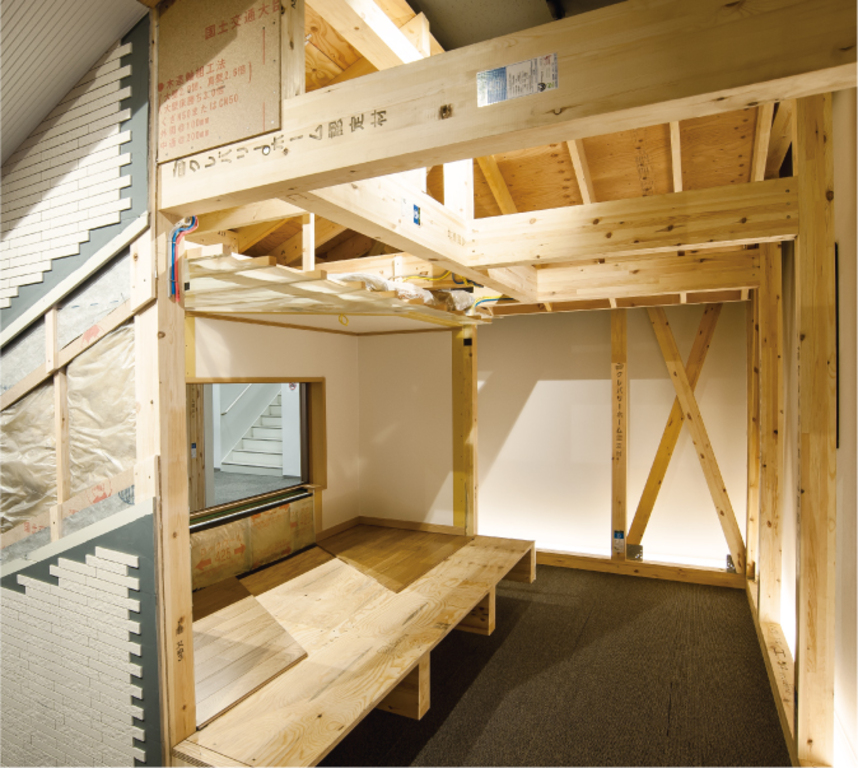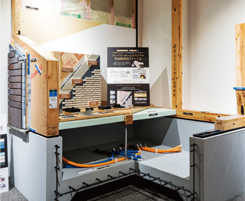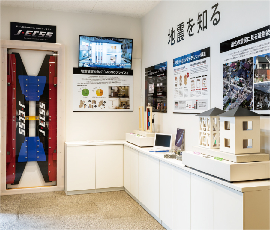 建物にかかるエネルギーをバランスよく受け止める、2つの構造を組み合わせた「プレミアム・ハイブリッド構法」の構造躯体をはじめ、基礎、床、壁、天井など、高耐震・ 高耐久を発揮する構造モデルを実物大で再現。高品質な部材を使用した確かな施工技術をしっかりとご確認ください。