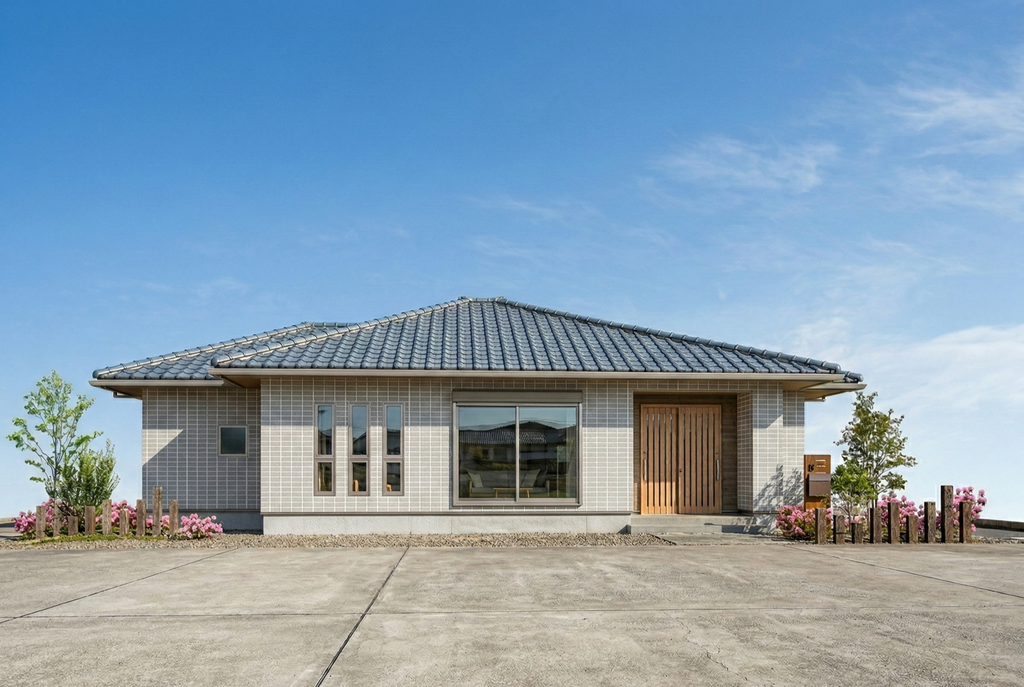 周囲の景観に馴染む、落ち着いた寄棟屋根の平屋。