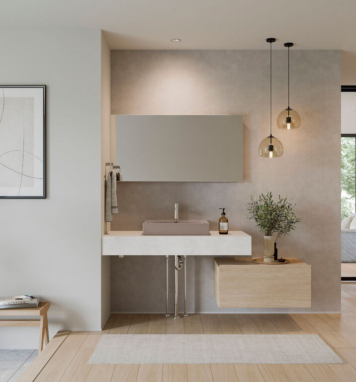 スタイリッシュなワイドサイズの洗面台は家族で並んで使えるため、忙しい朝の洗面所渋滞も防ぎます。