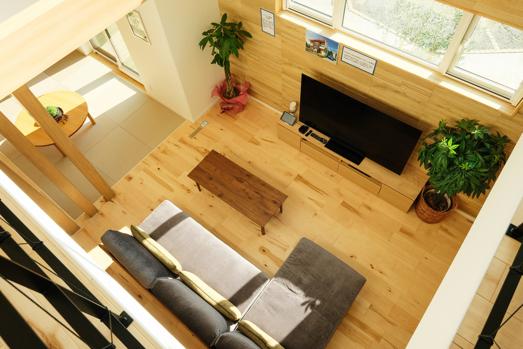 高い天井から自然光がたっぷりと降り注ぐ、明るく広々としたリビング。「吹き抜けは冬寒くなりそう…」と心配される方も多いですが、高気密・高断熱の家ならその心配はありません。上下階の温度差が少なく空気がムラなく循環するため、大空間の開放感と足元までの暖かさをしっかり両立しています。