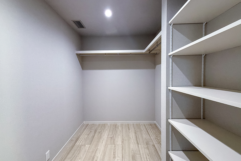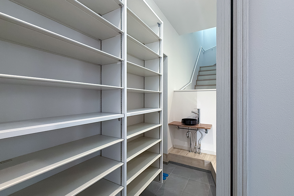 玄関のシューズクローク、キッチン横のパントリー、2階のウォークインクローゼットなど、まとまった収納スペースが充実。