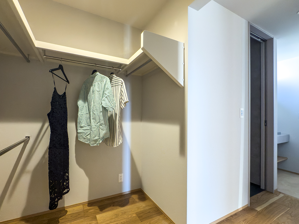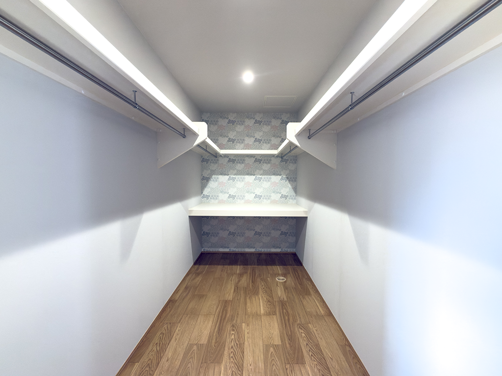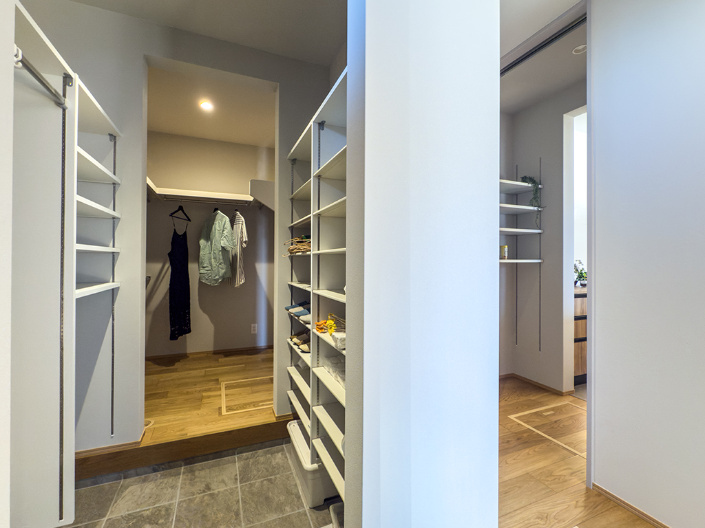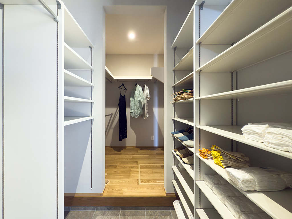 2階には、季節の衣類や家族の共有物をまとめて収納できる広々としたウォークインクローゼットを配置。