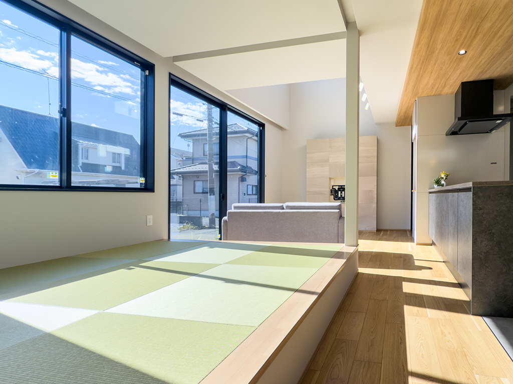リビングと繋がる小あがりの和室は、扉で区切らない緩やかな繋がりが魅力。