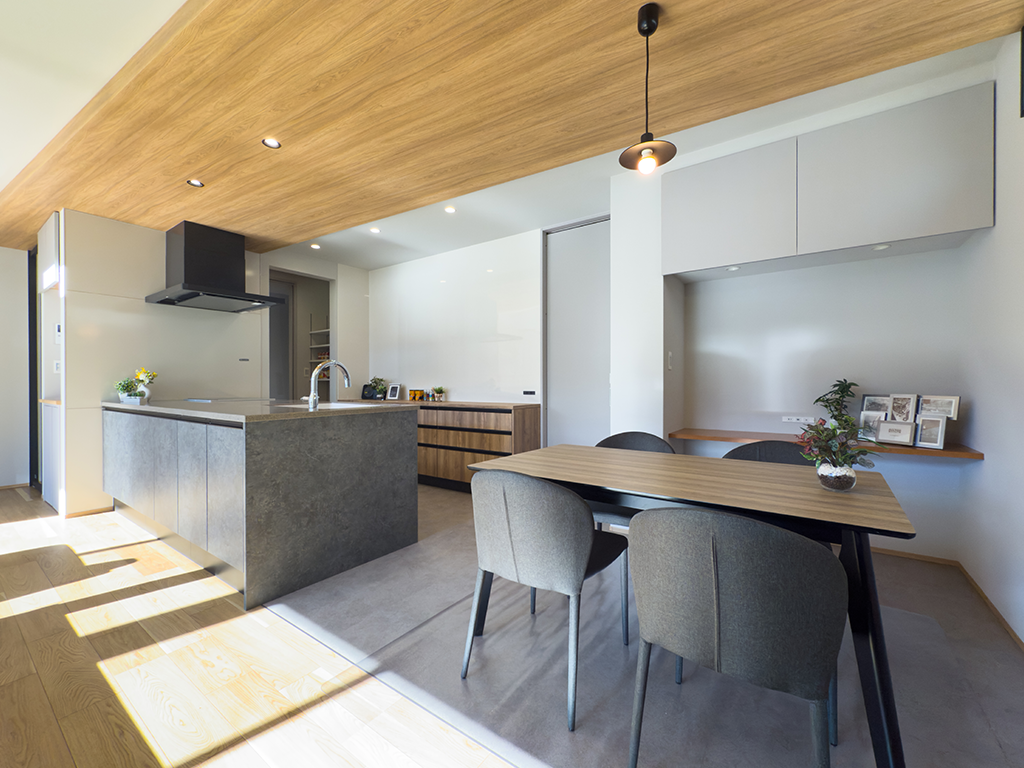 家族が集まるリビングには折下天井を施し、空間に安らぎをプラス。