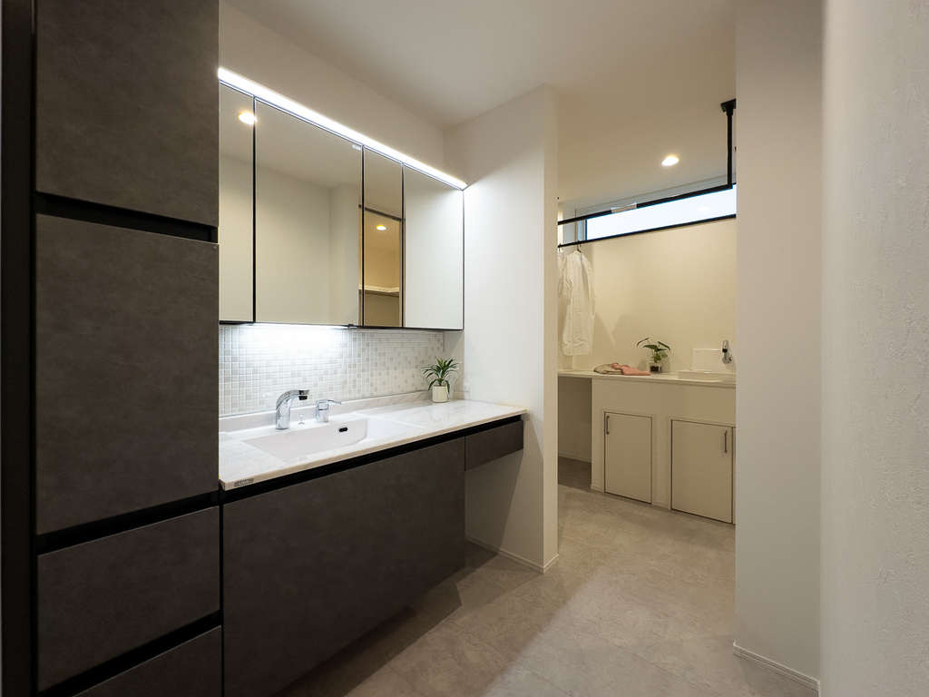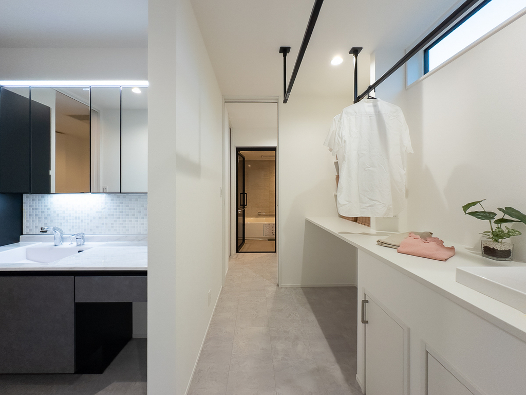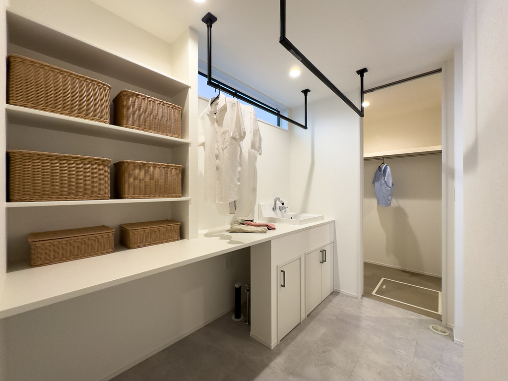 ランドリールームとファミリークローゼットを隣接させた配置は、「洗う → 干す → しまう」のステップが最短で完結するため、毎日の家事負担を大幅に軽減。