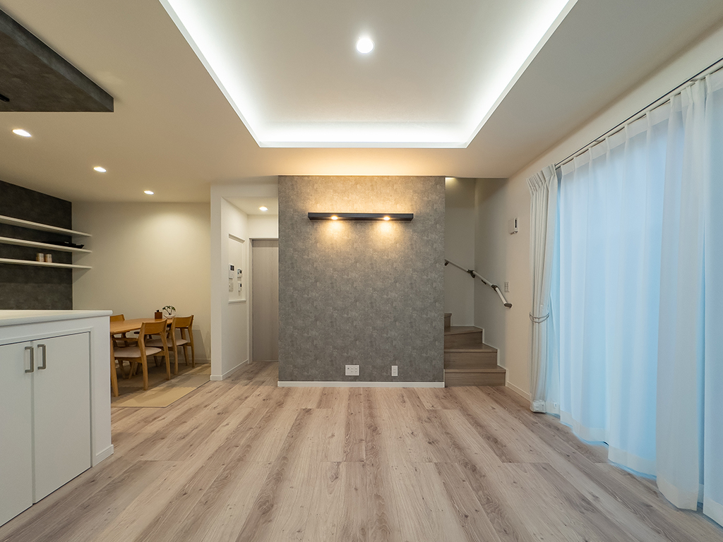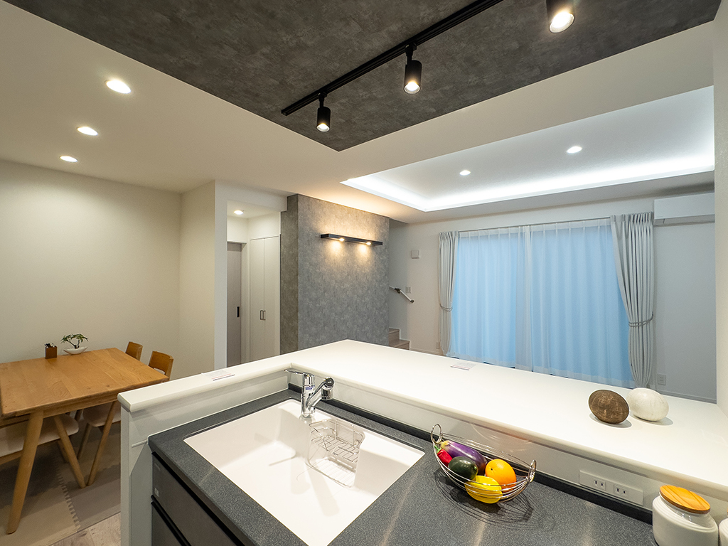 奥行きを感じさせる照明デザインと、家事の負担を軽減する回遊動線。