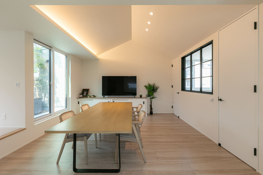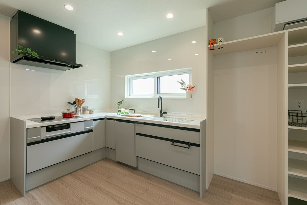 壁付けのL型キッチンは、空間にゆとりをもたらし家具の配置もしやすく、リビング全体の空間バランスが整います。また、動線が効率良く、料理をしながらも家族との会話が弾みやすく、家事が楽しくなる空間です。