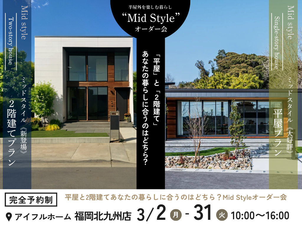 | タイトル | 【アイフルホーム福岡北九州店】平屋と2階建あなたの暮らしに合うのはどちら?MidStyleオーダー会 |