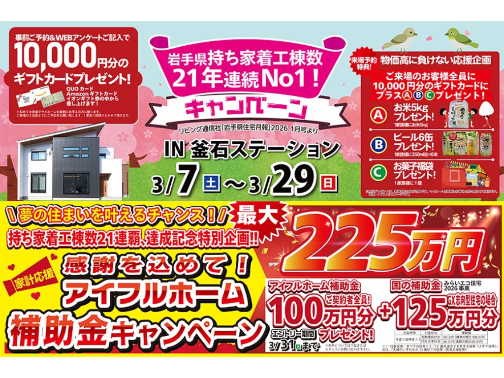 | タイトル | 【釜石】おかげさまで30周年!持ち家着工棟数21年連続No.1!マイホームフェア |