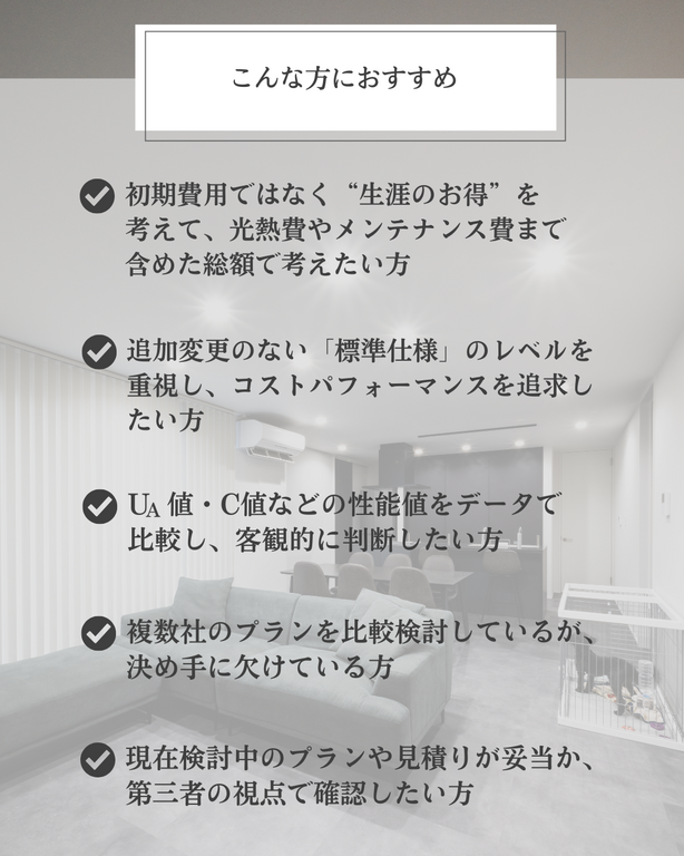お客様の家づくり計画を客観的なデータと数値で「見える化」し、後悔しないための最終チェックをお手伝いします。