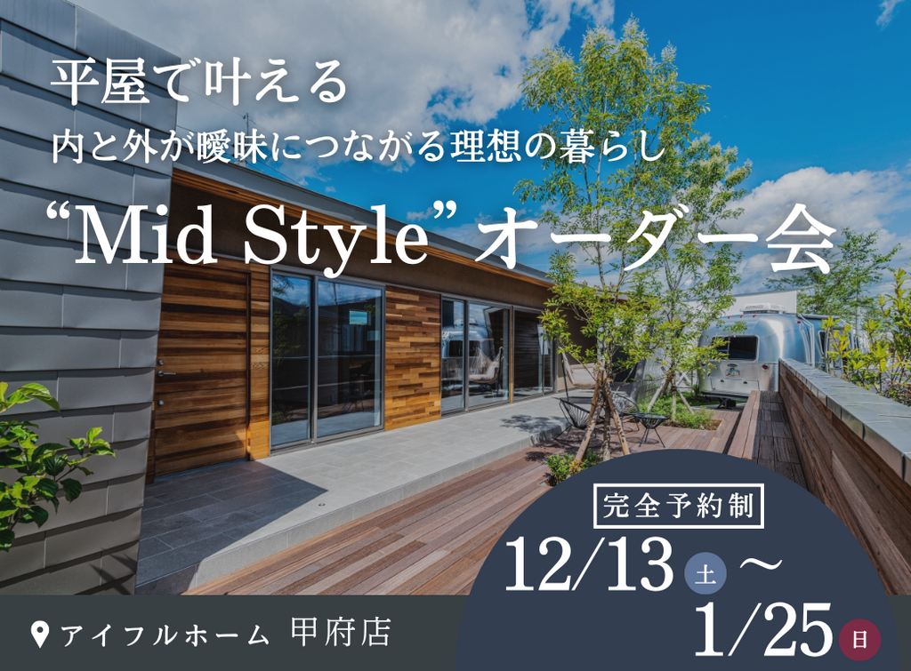 | タイトル | 平屋で叶える内と外が曖昧につながる理想の暮らし“Mid Style”オーダー会 |