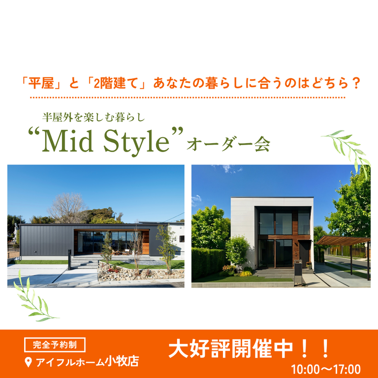 | タイトル | 【小牧店】平屋と2階建てあなたの暮らしに合うのはどちら?Mid Styleオーダー会 |