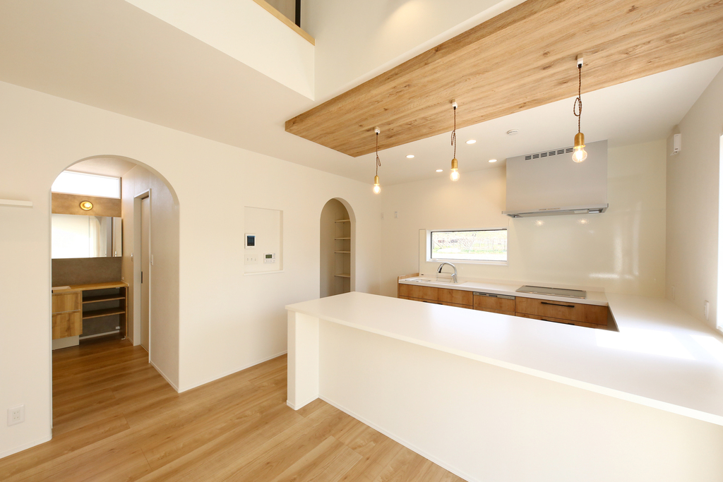 以前のお住まいの狭さが気になっていたお施主様。お持ちの土地でも十分な広さや空間が確保できるようLDKに勾配天井を取り入れたり、無駄なスペースを省くことで納得の開放感に仕上がりました。