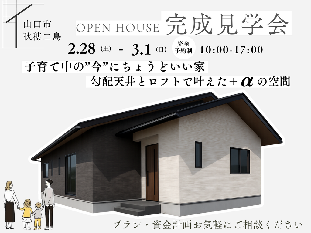 | タイトル | 【完成見学会】子育て中の”今”にちょうどいい平屋の家 |