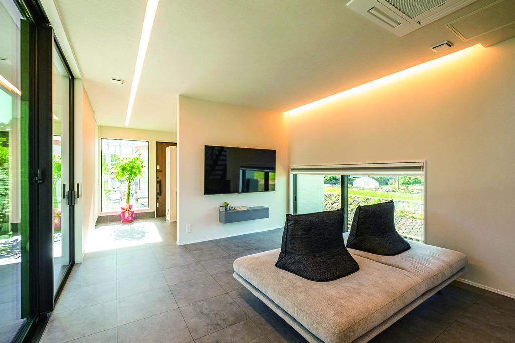 ソファに座った低い目線から逆川の景色を眺めることができる贅沢なリビング。シャープな間接照明もおしゃれ。ダイニングキッチンとゾーニングしたことで空間にメリハリがついた