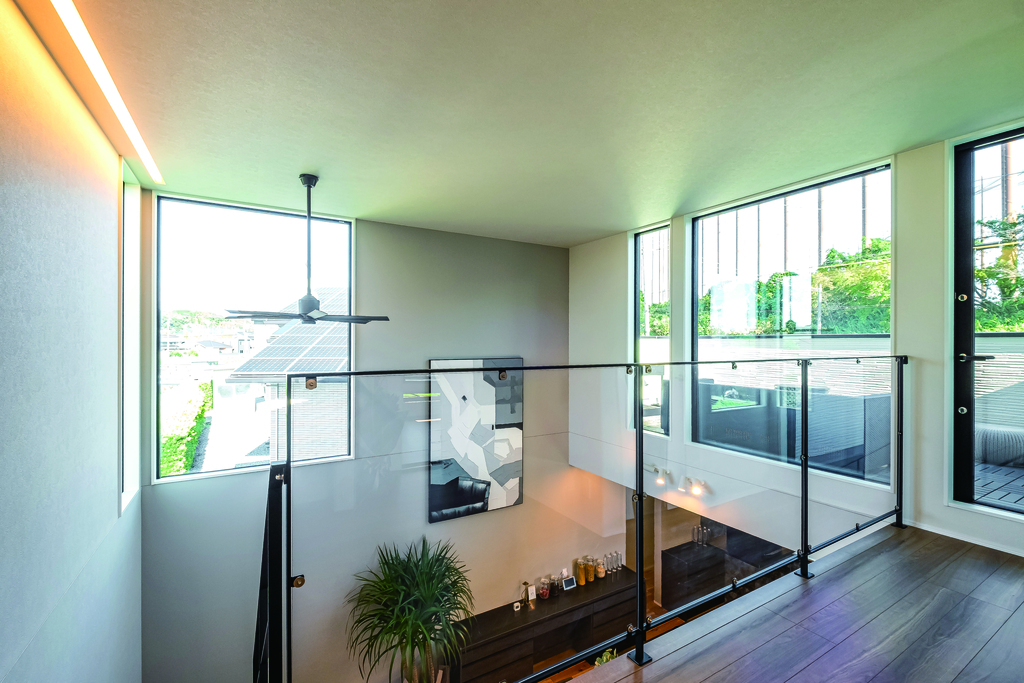 南の空に向かって視線が抜けていく大空間は開放感に満ちている。これほどたくさんの窓を設置していながら耐震等級3とHEAT20 G2レベルの断熱性能を実現しています