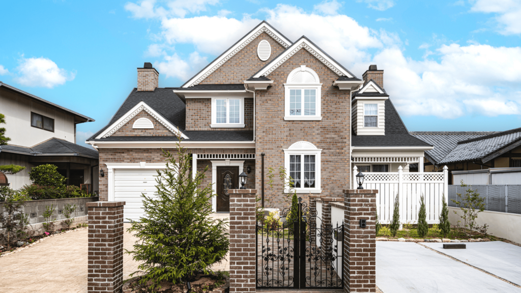 重厚な煉瓦を外壁全体に用い、どっしりとした安定感を与えています。正面に見える装飾的なドーマー窓や、細部に施された白い装飾が、伝統的なエレガンスを強調しています。シンメトリーを意識した整然としたファサードは、歴史あるヨーロッパ建築のエッセンスを受け継いでいます。