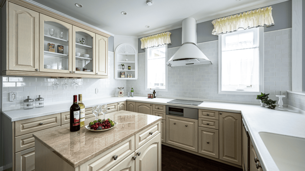 温かみのあるベージュ系のキャビネットと、光沢のある大理石のアイランドカウンターが印象的な、優雅で機能的なキッチン空間です。