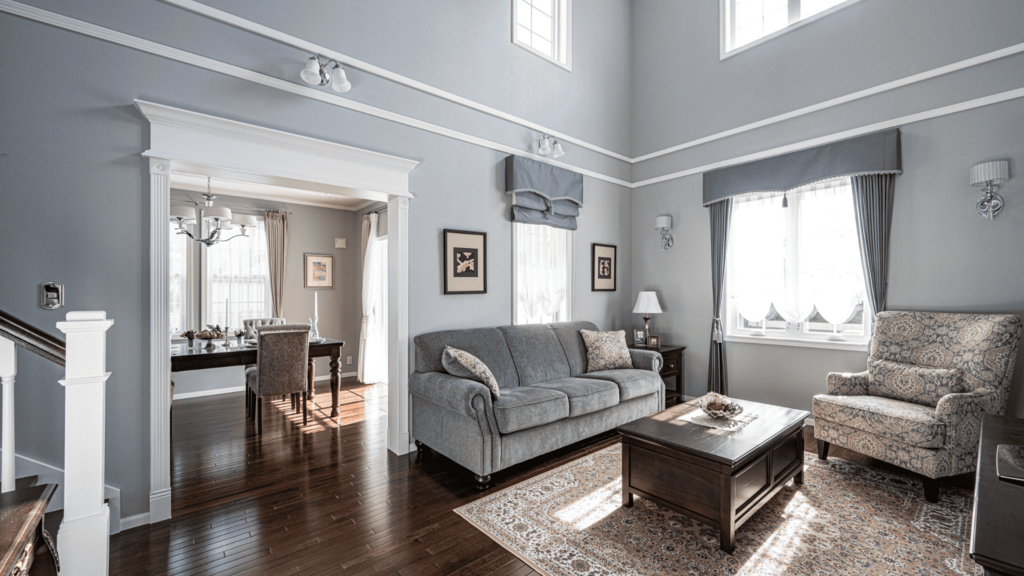 落ち着いたグレーの壁色と、重厚なダークウッドのフローリングが見事に調和した、洗練されたリビング空間です。