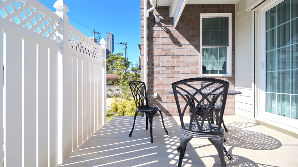 明るい日差しが降り注ぐ、プライベートなバルコニー・テラス空間です。