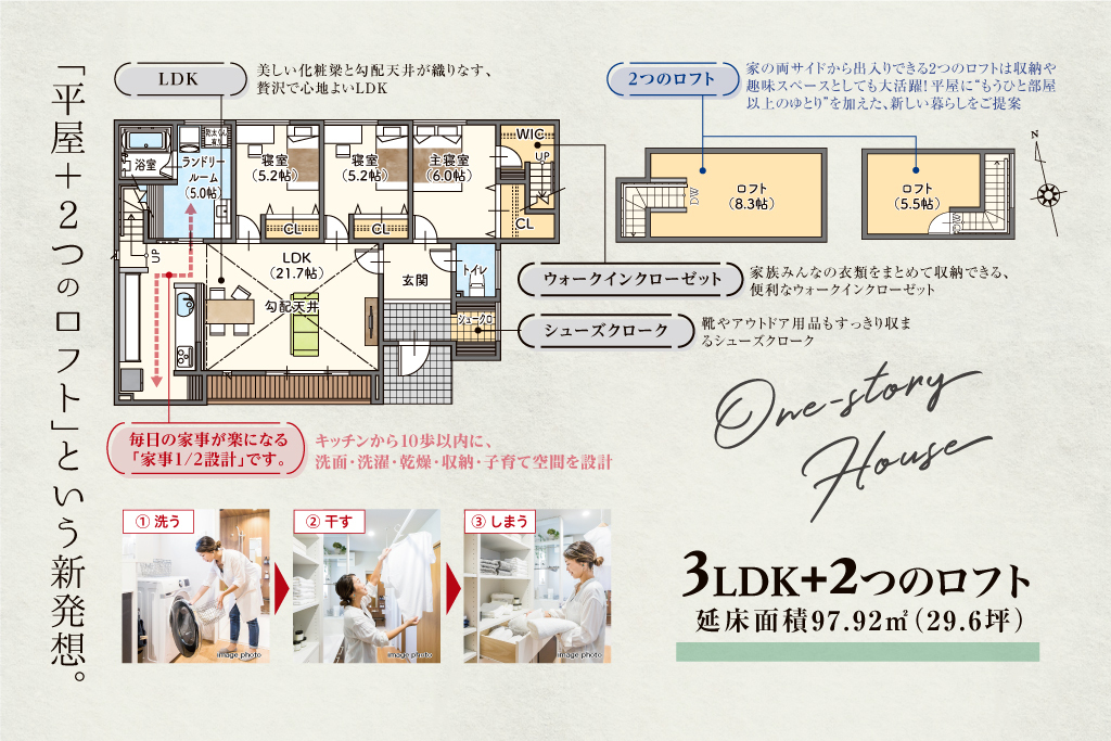 キッチンから10歩以内に、洗面・洗濯・乾燥・収納・子育て空間を設計