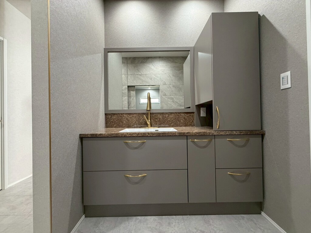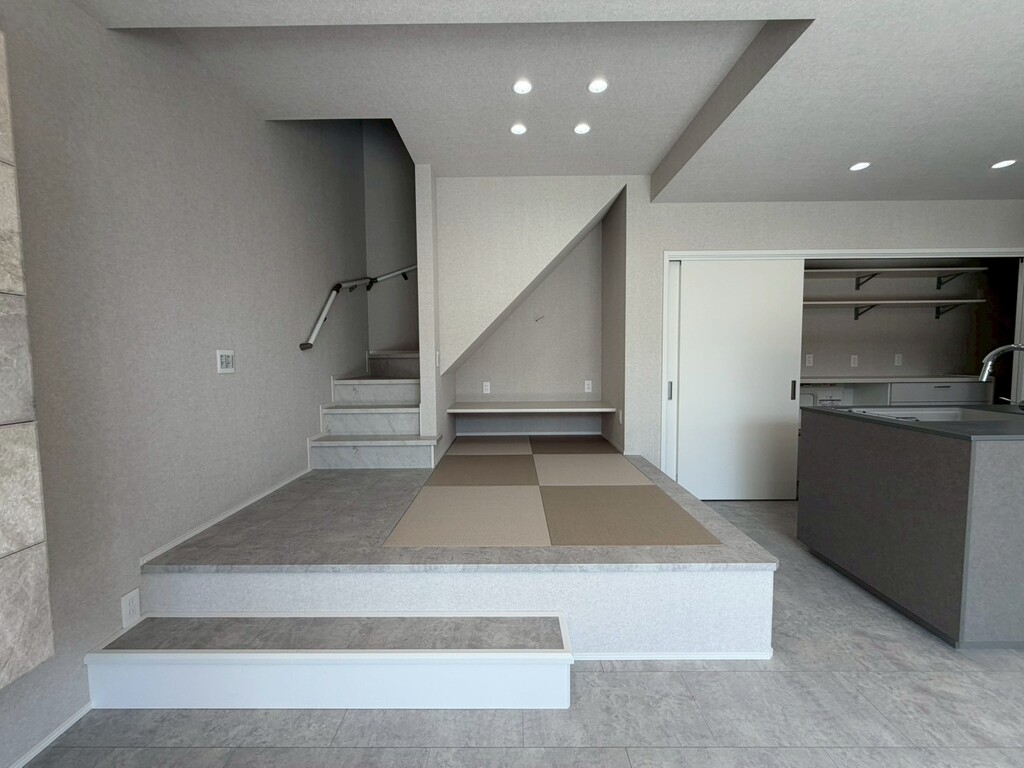 洗練された造作洗面台、視線を遮らない小上がりの畳コーナー、そして遊び心をくすぐる「隠し扉」の先の衣装部屋。