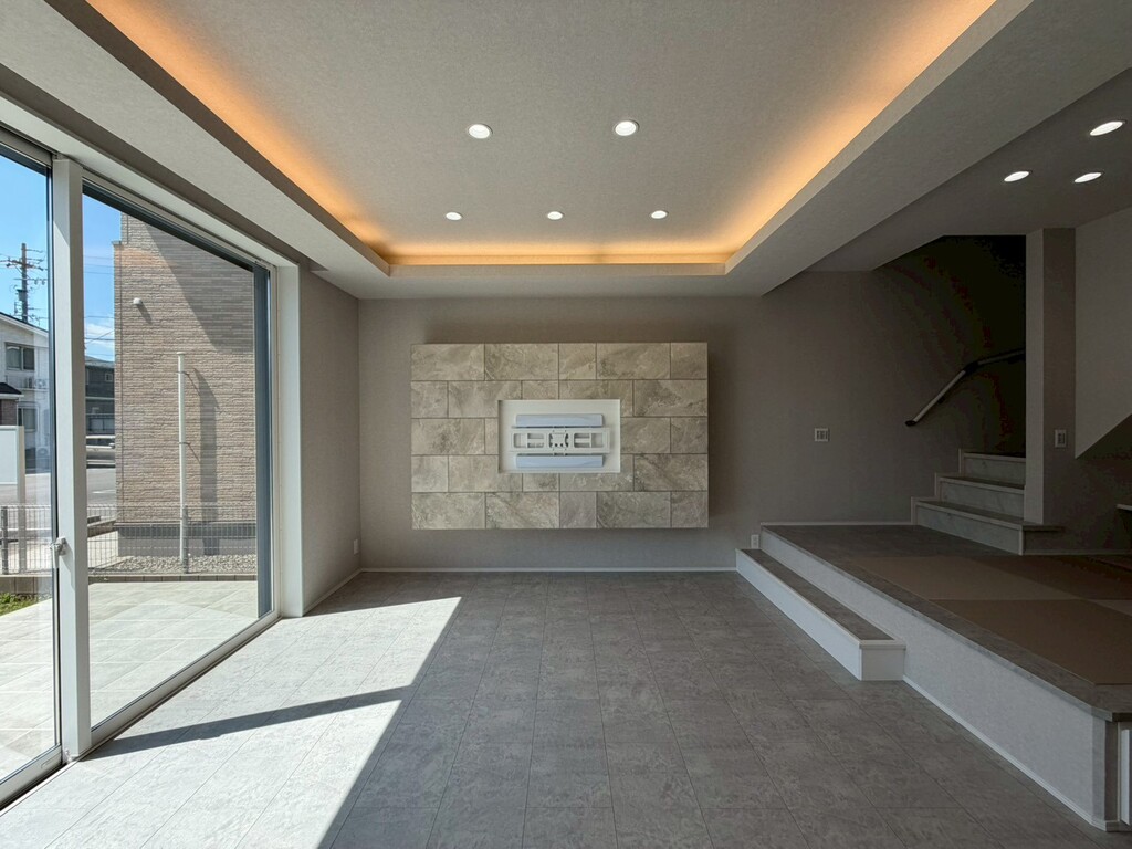木造トラス構造が可能にした「6.5mの無柱空間」が、20帖超のLDKに圧倒的な開放感をもたらします。天井を彩る間接照明の柔らかな光は、まるで高級ホテルのスイートルーム。